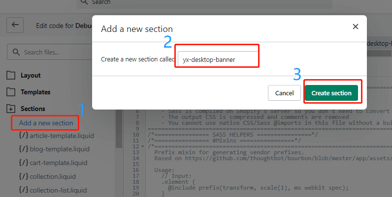 Add new section called “yx-desktop-banner”,then your can see a liquid file called yx-desktop-banner.liquid will be added in your sections directory.